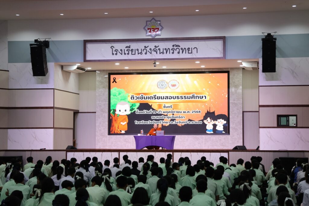 วันที่ 19-21 พฤศจิกายน 2568 โรงเรียนวังจันทร์วิทยา ร่วมกับกลุ่มสาระการเรียนรู้สังคมศึกษา ศาสนา และวัฒนธรรม ได้ร่วมปลูกฝัง คุณธรรม จริยธรรม และธรรมศึกษา ให้กับนักเรียนระดับชั้นมัธยมศึกษาตอนปลาย โดยได้รับความเมตตาจากพระครูวิเศษศุภกิจ เจ้าอาวาสวัดบึงตากาด เป็นผู้ให้การอบรมด้านคุณธรรม จริยธรรม และธรรมศึกษา แก่นักเรียน ณ ห้องประชุมจันทร์ดา โรงเรียนวังจันทร์วิทยา