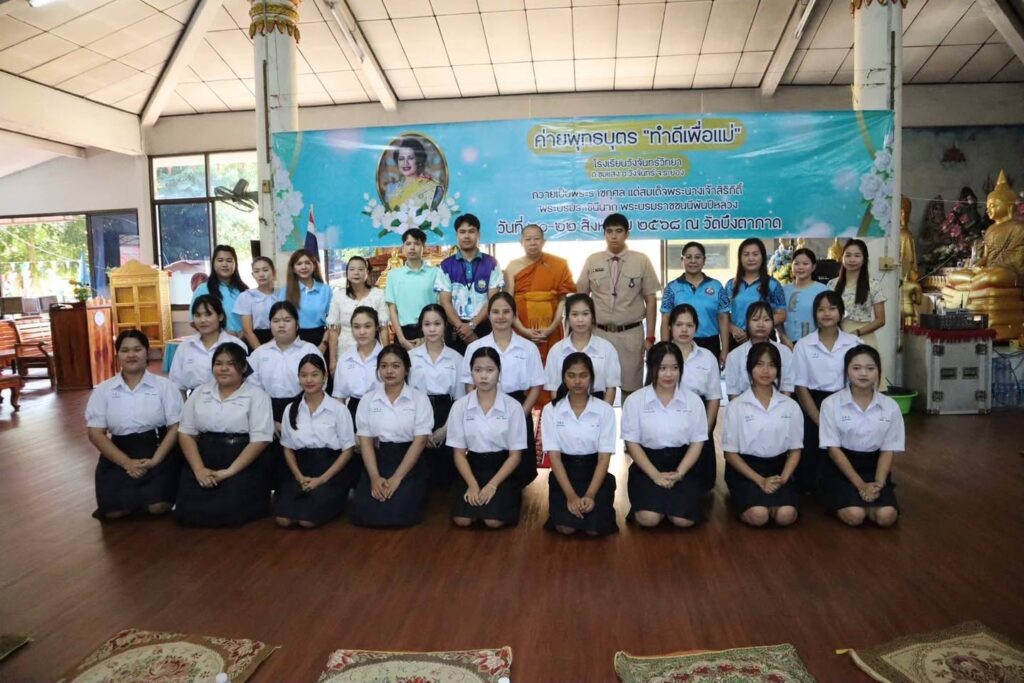 วันที่ 20-22 สิงหาคม 2568 งานส่งเสริมคุณธรรมจริยธรรม กลุ่มบริหารทั่วไป ได้ดำเนินการจัดกิจกรรมค่ายพุทธบุตร "ทำดีเพื่อแม่" ประจำปีการศึกษา 2568 ถวายเป็นพระราชกุศลแด่สมเด็จพระนางเจ้าสิริกิติ์ พระบรมราชินีนาถ พระบรมราชชนนีพันปีหลวง ได้รับเกียรติจากนางสมัชญา ผุดผ่อง รองผู้อำนวยการโรงเรียนวังจันทร์วิทยา เป็นประธานในพิธี พร้อมด้วยคณะกรรมการสถานศึกษา คณะผู้บริหาร คณะครูและนักเรียนหญิงระดับชั้นมัธยมศึกษาปีที่ 5 เข้าร่วมกิจกรรมในครั้งนี้ ซึ่งการจัดกิจกรรมมีวัตถุประสงค์ เพื่อส่งเสริมการดำเนินชีวิตตามหลักพระพุทธศาสนานักเรียนมีคุณธรรม จริยธรรมอันดีงาม และตระหนักถึงการใช้ชีวิตอย่างพอเพียง ณ วัดบึงตากาด อำเภอวังจันทร์ จังหวัดระยอง