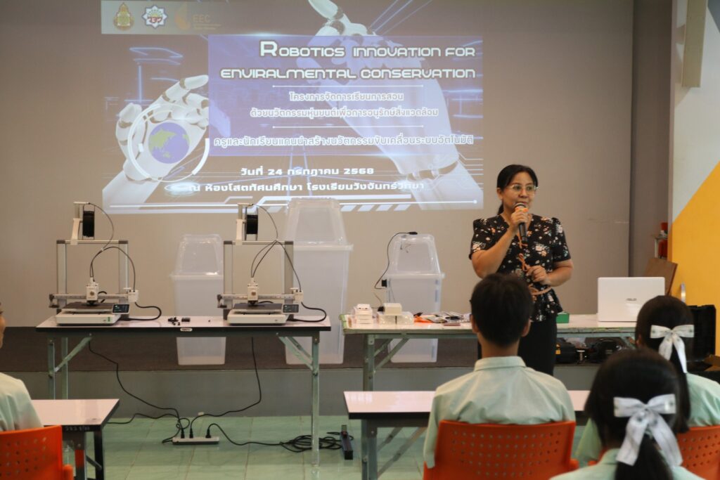 วันที่ 24 กรกฎาคม 2568 นายศักดา สรรเสริญ ผู้อำนวยการโรงเรียนวังจันทร์วิทยา มอบหมายให้นางสมัชญา ผุดผ่อง รองผู้อำนวยการโรงเรียน เป็นประธานพิธีเปิดโครงการจัดการเรียนการสอนด้วยนวัตกรรมหุ่นยนต์เพื่อการอนุรักษ์สิ่งแวดล้อม เสริมทักษะด้าน STEM และ AI พร้อมปลูกฝังจิตสำนึกด้านสิ่งแวดล้อมให้นักเรียน ผ่านการออกแบบ พัฒนา และเขียนโปรแกรมควบคุมหุ่นยนต์