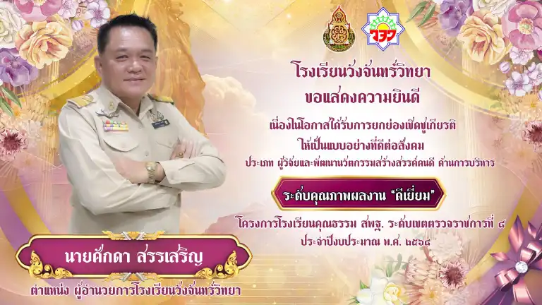 โรงเรียนวังจันทร์วิทยา ขอแสดงความยินดีกับนายศักดา สรรเสริญ ผู้อำนวยการโรงเรียนวังจันทร์วิทยา เนื่องในโอกาสได้รับการยกย่องเชิดชูเกียรติ