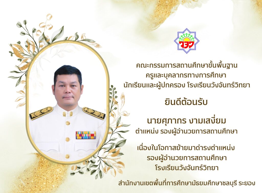 คณะกรรมการสถานศึกษาขั้นพื้นฐาน ผู้บริหาร คณะครู นักเรียนและผู้ปกครอง โรงเรียนวังจันทร์วิทยา ขอแสดงความยินดีและยินดีต้อนรับ นายศุภากร งามเสงี่ยม ในโอกาสย้ายมาดำรงตำแหน่ง รองผู้อำนวยการสถานศึกษา โรงเรียนวังจันทร์วิทยา
