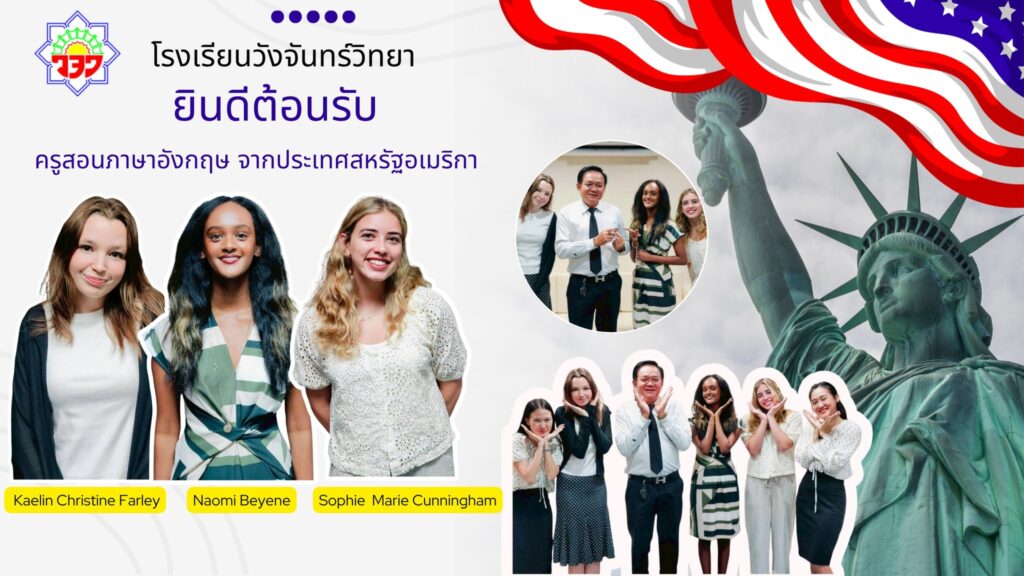 โรงเรียนวังจันทร์วิทยา ขอแสดงความยินดีและให้การต้อนรับ Miss Kaelin Christine Farley, Miss Naomi Beyene และ Miss Sophie Marie Cunningham ครูผู้สอนวิชาภาษาอังกฤษชาวอเมริกัน ซึ่งได้มาร่วมเป็นส่วนหนึ่งในการพัฒนาการเรียนรู้ภาษาอังกฤษของนักเรียน เพื่อเสริมสร้างทักษะสู่ความเป็นพลโลกอย่างมั่นใจ ![]()