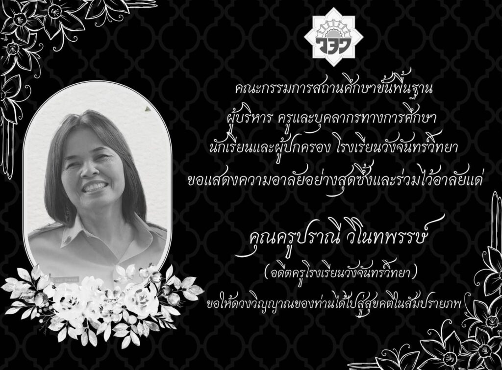 คณะกรรมการสถานศึกษาขั้นพื้นฐาน ผู้บริหาร ครูและบุคลากรทางการศึกษา นักเรียนและผู้ปกครอง โรงเรียนวังจันทร์วิทยา ขอแสดงความอาลัยอย่างสุดซึ้ง และร่วมไว้อาลัยแด่ ครูปราณี วิโนทพรรษ์ (อดีตครูโรงเรียนวังจันทร์วิทยา)