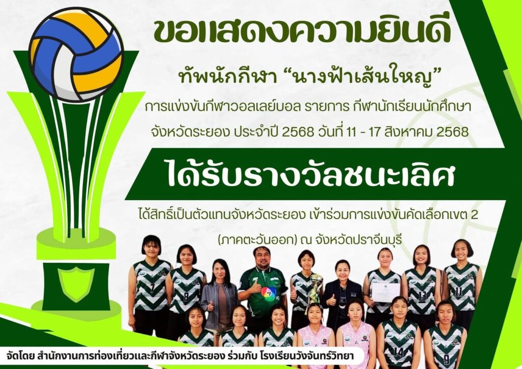 รายการแข่งขันกีฬานักเรียน นักศึกษา ระหว่างโรงเรียน จังหวัดระยอง ประจำปี 2568 ได้รับรางวัล #ชนะเลิศ (ทีมหญิง) ณ สนามโรงเรียนวังจันทร์วิทยา👏👏#ได้สิทธิ์เป็นตัวแทนจังหวัดระยอง เข้าร่วมการแข่งขันคัดเลือกเขต2 (ภาคตะวันออก) ณ จังหวัดปราจีนบุรี 👏👏
