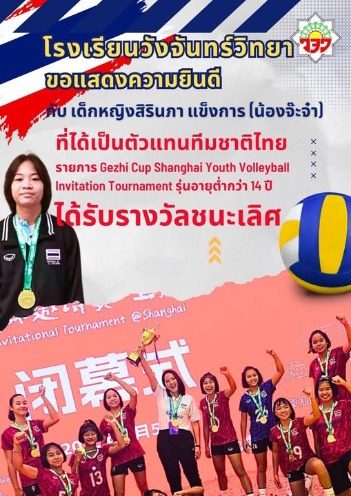 โรงเรียนวังจันทร์วิทยาขอแสดงความยินดีกับเด็กหญิงสิรินภา แข็งการ นักเรียนชั้นมัธยมศึกษาปีที่ 1 เป็นตัวแทนทีมชาติไทย #ได้รับรางวัลชนะเลิศ รายการแข่งขันกีฬาวอลเลย์บอล รุ่นอายุต่ำกว่า 14 ปี รายการ Gezhi cup Shanghai Youth Volleyball Invitation Tournament ณ นครเซี่ยงไฮ้ สาธารณรัฐประชาชนจีน