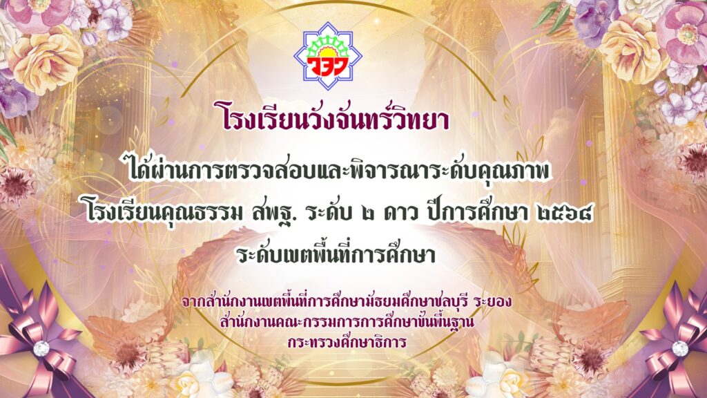 โรงเรียนวังจันทร์วิทยาได้ผ่านการตรวจสอบและพิจารณาระดับคุณภาพ โรงเรียนคุณธรรม สพฐ. ระดับ 2 ดาว ปีการศึกษา 2568 ระดับเขตพื้นที่การศึกษา
