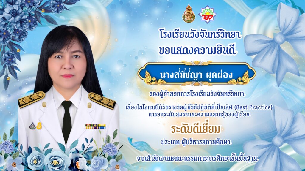 โรงเรียนวังจันทร์วิทยา ขอแสดงความยินดีกับนางสมัชญา ผุดผ่อง รองผู้อำนวยการโรงเรียน เนื่องในโอกาสได้รับรางวัลผู้มีวิธีปฏิบัติที่เป็นเลิศ (Best Practice) การยกระดับสมรรถนะความฉลาดรู้ของผู้เรียน #ระดับดีเยี่ยม #ประเภทผู้บริหารสถานศึกษา จากสำนักงานคณะกรรมการการศึกษาขั้นพื้นฐาน
